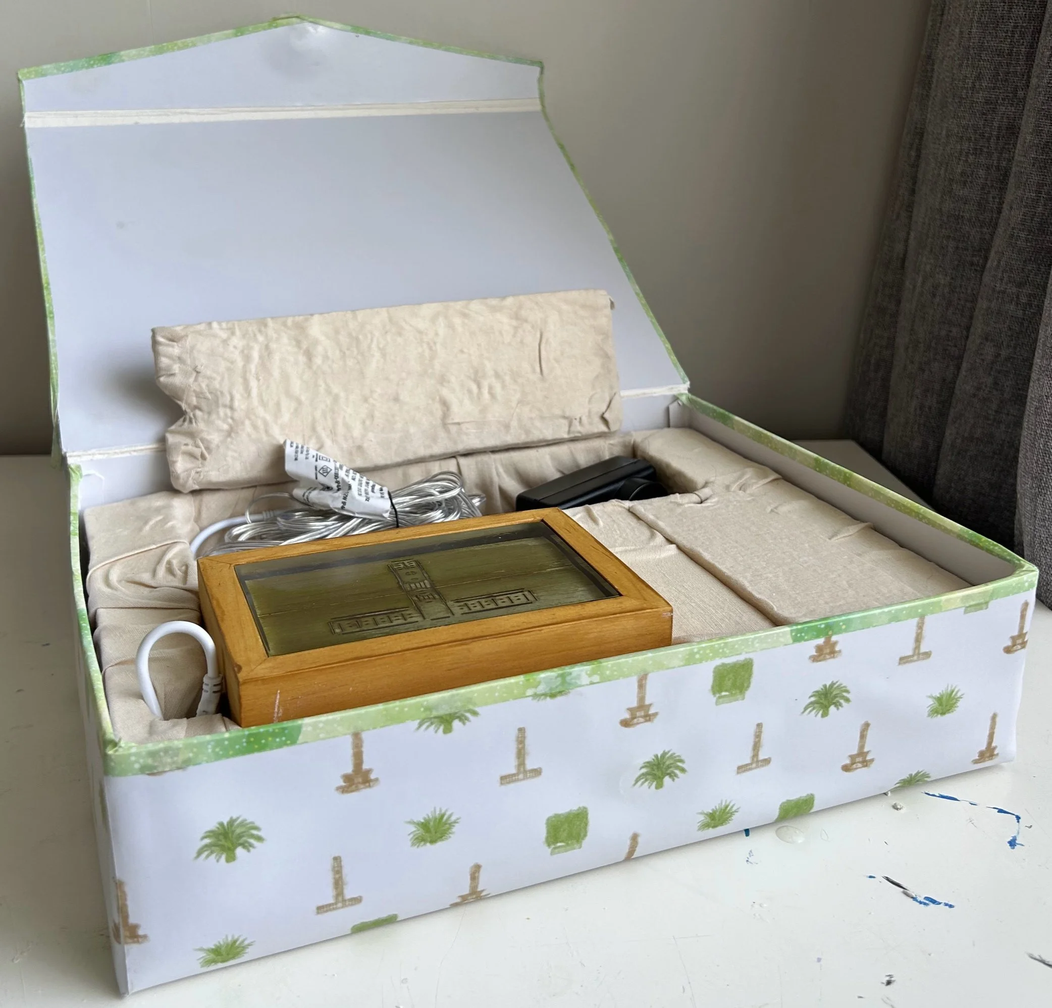 The box flips open with the logo on the lid. I’ve called the business “Tiny Palmy”. I would imagine that this business would make other miniature historical palmy souvenirs, therefore the name. The “l” of palmy is a clock tower.